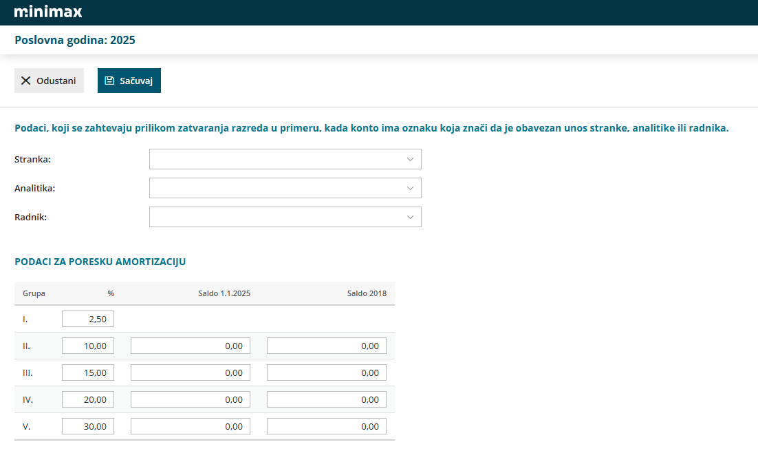 Ukoliko smo u toku godine menjali podešavanja konta i stavili da je podatak o stranci, analitici ili radniku obavezan, ovde je potrebno odabrati koja stranka, analitika ili radnik će biti uneta na onim knjiženjima na kojima ovaj podatak nije bio unet dok nije bio obavezan unos na podešavanju konta: