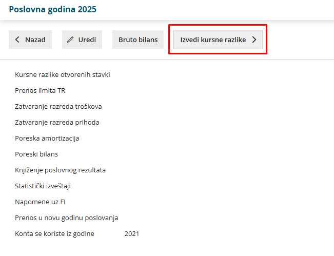 Izračunaju se kursne razlike na sve obaveze i potraživanja na dan 31.12. i napravi se nalog za knjiženje. Ako podataka za obradu kursnih razlika nema, prikazaće se obaveštenje da nije napravljen nalog za knjiženje.