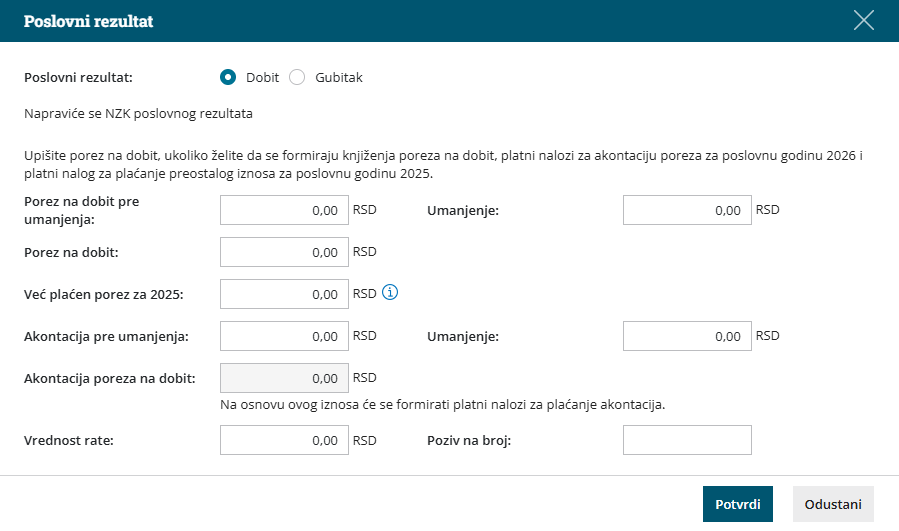 Ukoliko je rezultat Dobitak dobijamo podatke za pripremu akontacija za porez na dobit. Detaljano uputstvo na LINK-u