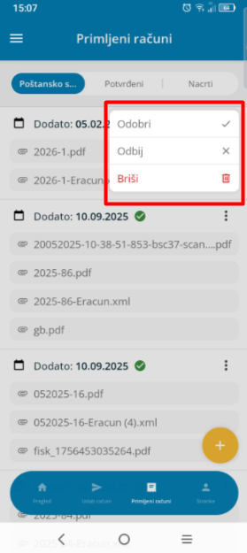 Iz same mobilne aplikacije imamo mogućnost da odobravamo i odbijamo primljene efakture.