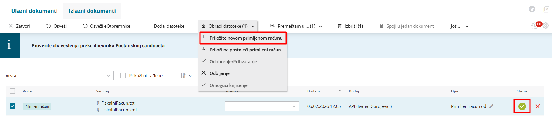 - Kada smo račun odobrili i dodali stranku možemo ga Priložiti novom primljenom računu: