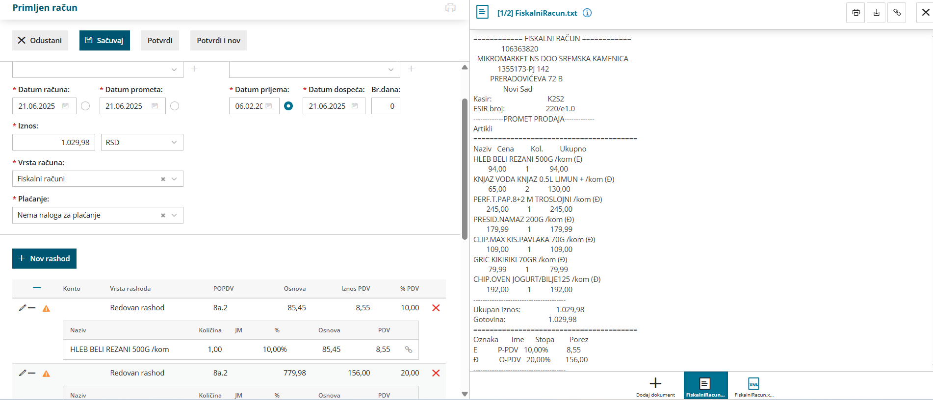 - Sačuvamo i drugi rashod u računu i potvrdimo račun: