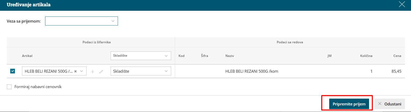 - Nakon što su artikli povezani kliknemo na pripremite prijem: