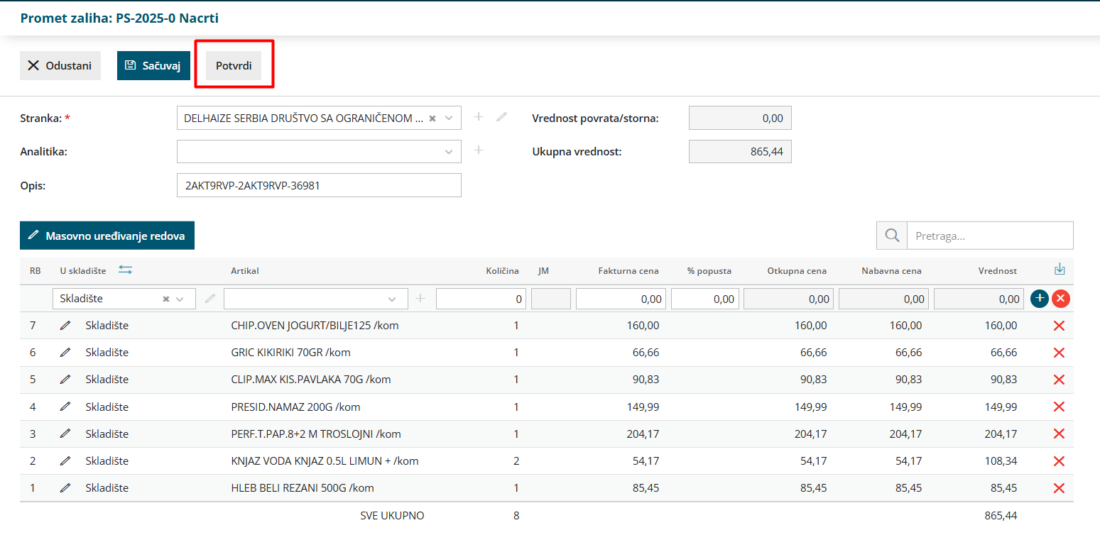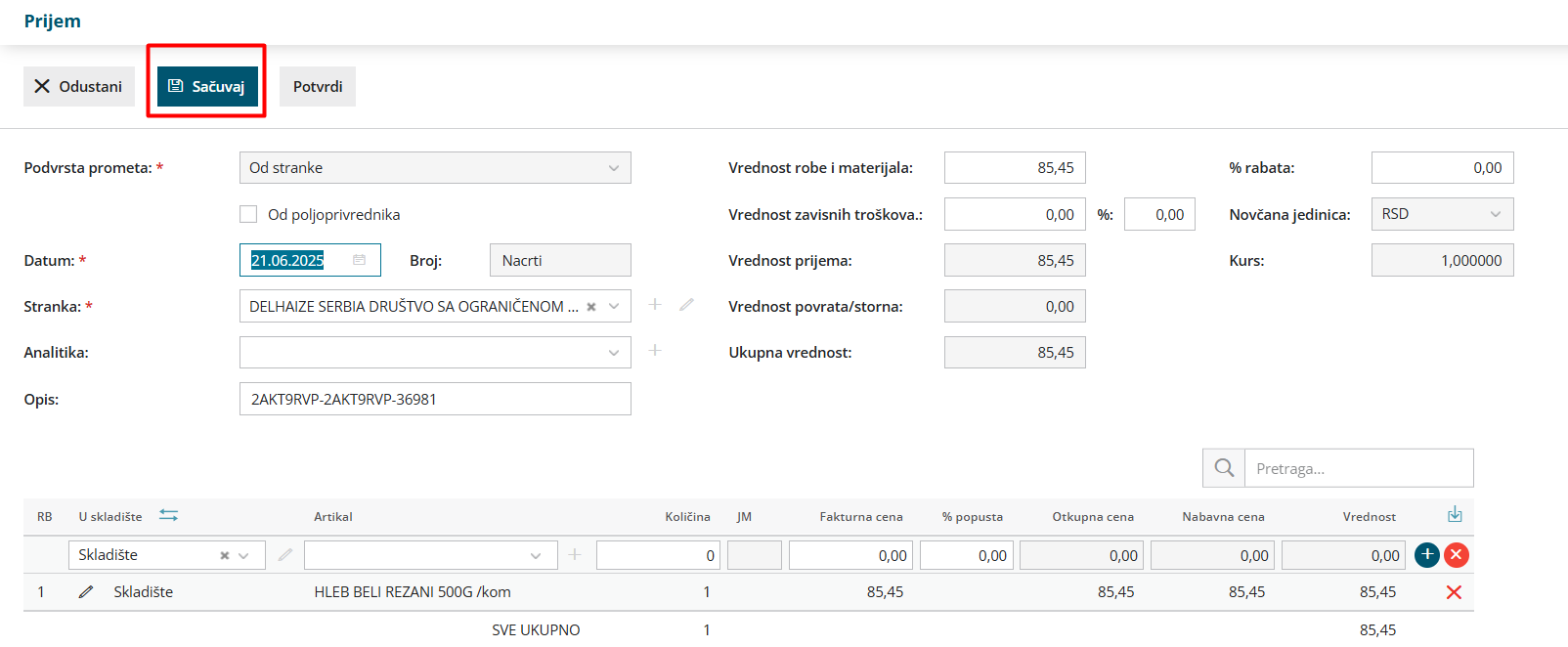 - Dobijamo prijem sa svim artiklima i POTVRDIMO prijem: