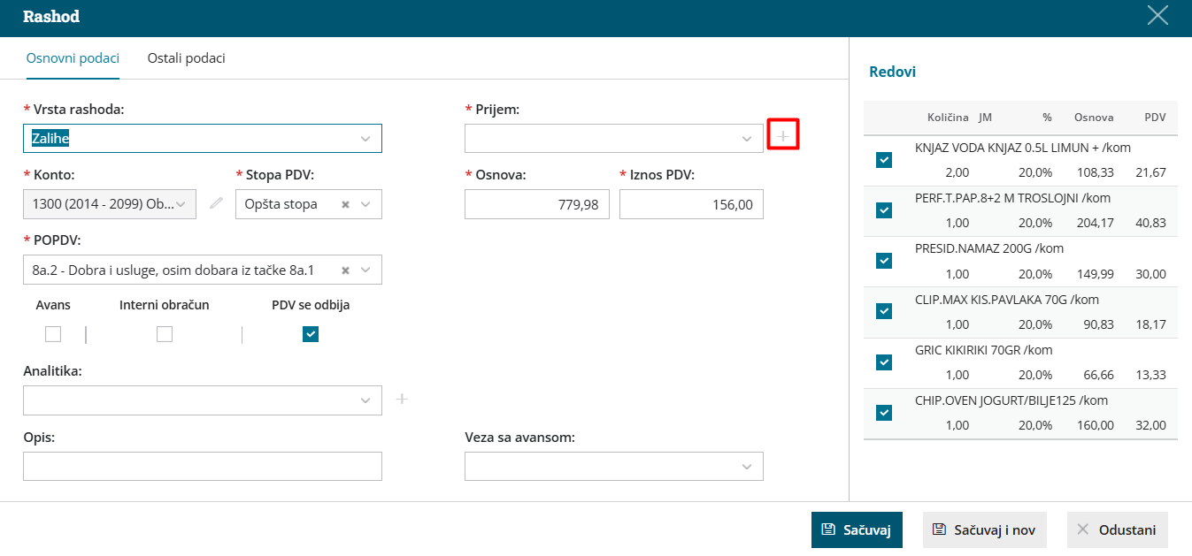 - Vrsta rashoda je zaliha, čekirani su nam svi artikli i po ovoj stopi PDV-a i po potrebi ih možemo odčekirati ukoliko iz nekog razloga ne želimo da budu u ovom prijemu. Klikom na plus pored polja prijem kreiramo kalkulaciju